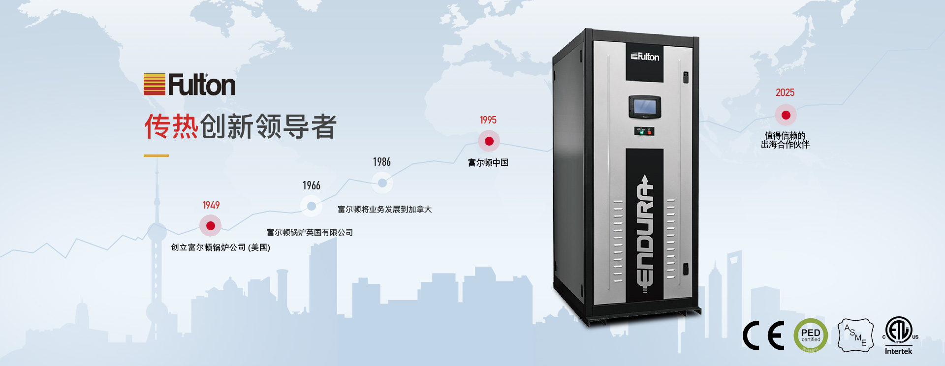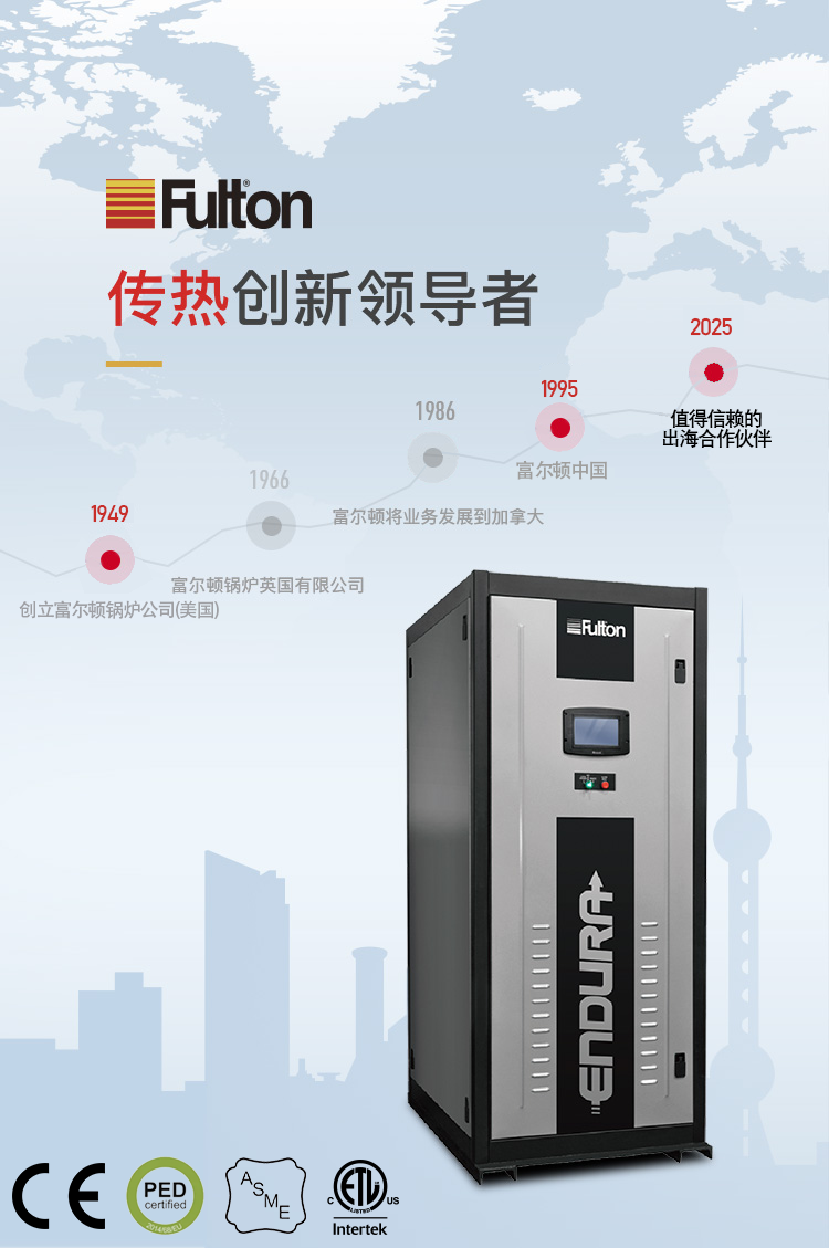 富爾頓是國際著名的跨國高質(zhì)量傳熱產(chǎn)品制造商,具有七十多年的專業(yè)設(shè)計(jì)、制造、銷售鍋爐的經(jīng)驗(yàn),是立式無管鍋爐和脈沖燃燒鍋爐的發(fā)明者,幾十年來一直領(lǐng)導(dǎo)世界鍋爐新潮流。